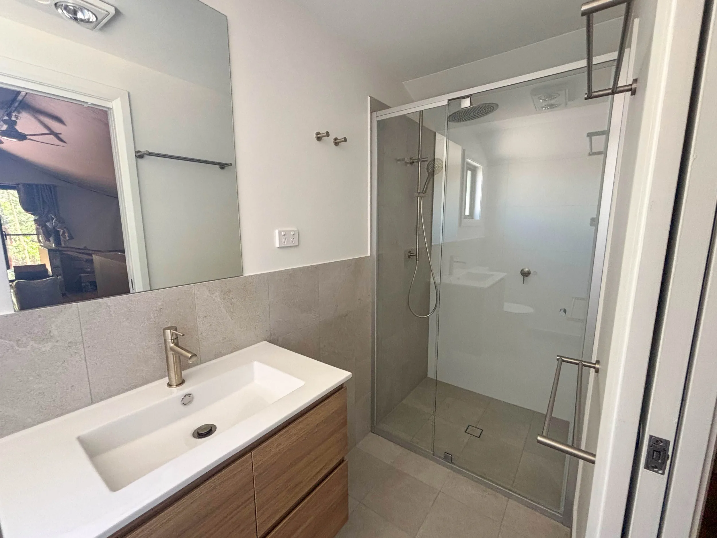 Ensuites are built in Ballina using Colorbond exteriors, tiled interiors and high-quality fixtures designed for luxury and commercial use. Clients can select between a Standard ensuite, an extended Honeymoon ensuite with double shower, separate WC and luxury fittings, or an Accessible ensuite with customised floorplan and specialised fittings.